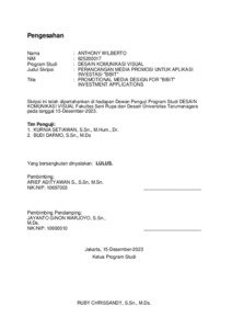 Wilberto, Anthony (2024) Perancangan media promosi untuk aplikasi investasi "Bibit" (DKV - 3033). Skripsi thesis, Universitas Tarumanagara.