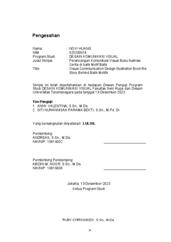 Huang, Novi (2024) Perancangan komunikasi visual buku ilustrasi cerita di balik motif batik (DKV - 3035). Skripsi thesis, Universitas Tarumanagara.
