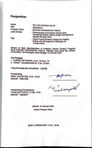 Salis, Felysia Regina (2024) Perancangan komunikasi visual untuk kampanye makan sehat dengan microgreens kepada remaja akhir (DKV - 3042). Skripsi thesis, Universitas Tarumanagara.