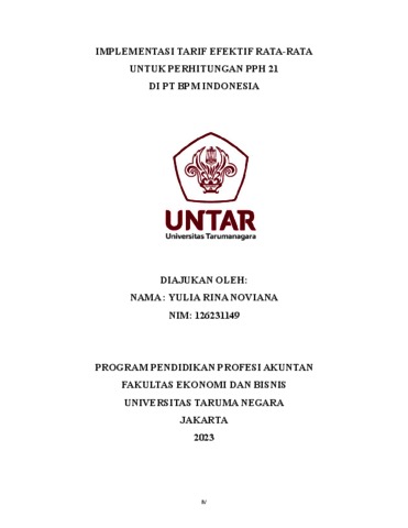 Noviana, Yulia Rina (2023) Implementasi tarfif efektif rata-rata untuk perhitungan PPH 21 di PT BPM Indonesia. Masters thesis, Universitas Tarumanagara.