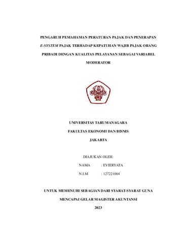 Evieryata, Evieryata (2023) Pengaruh Pemahaman Peraturan Pajak dan Penerapan E-System Pajak Terhadap Kepatuhan Wajib Pajak Orang Pribadi dengan Kualitas Pelayanan Sebagai Variabel Moderator. Masters thesis, Universitas Tarumanagara.