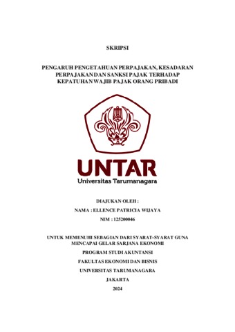 Wijaya, Ellence Patricia (2023) PENGARUH PENGETAHUAN PERPAJAKAN, KESADARAN PERPAJAKAN DAN SANKSI PAJAK TERHADAP KEPATUHAN WAJIB PAJAK ORANG PRIBADI. Skripsi thesis, Universitas Tarumanagara.