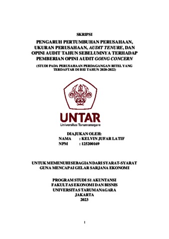Latif, Kevin Jufar (2023) PENGARUH PERTUMBUHAN PERUSAHAAN, UKURAN PERUSAHAAN, AUDIT TENURE, DAN OPINI AUDIT TAHUN SEBELUMNYA TERHADAP PEMBERIAN OPINI AUDIT GOING CONCERN. Skripsi thesis, Universitas Tarumanagara.