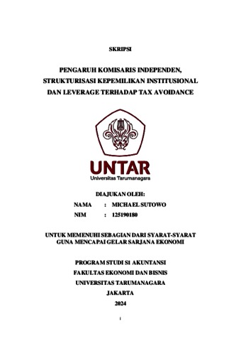 Sutowo, Michael (2023) PENGARUH KOMISARIS INDEPENDEN, STRUKTURISASI KEPEMILIKAN INSTITUSIONAL DAN LEVERAGE TERHADAP TAX AVOIDANCE. Skripsi thesis, Universitas Tarumanagara.