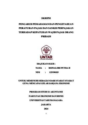 Putra, Reinaldri (2023) PENGARUH PEMAHAMAN DAN PENGETAHUAN PERATURAN PAJAK DAN SANKSI PERPAJAKAN TERHADAP KEPATUHAN WAJIB PAJAK ORANG PRIBADI. Skripsi thesis, Universitas Tarumanagara.