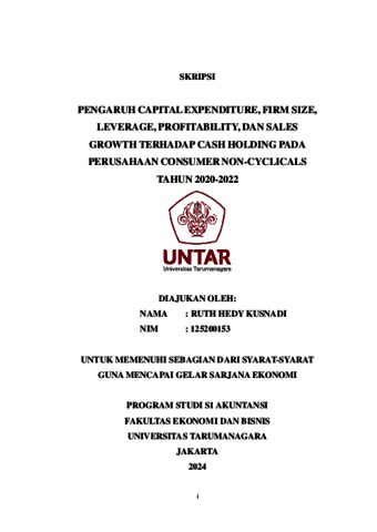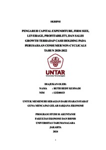 Kusnadi, Ruth Hedy (2023) PENGARUH CAPITAL EXPENDITURE, FIRM SIZE, LEVERAGE, PROFITABILITY, DAN SALES GROWTH TERHADAP CASH HOLDING PADA PERUSAHAAN CONSUMER NON-CYCLICALS TAHUN 2020-2022. Skripsi thesis, Universitas Tarumanagara.