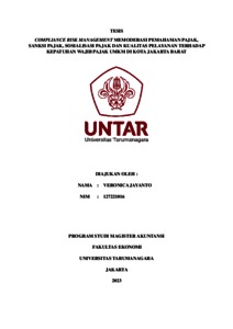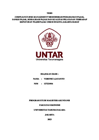 Jayanto, Veronica (2023) Compliance Risk Management Momoderasi Pemahaman Pajak, Sanksi Pajak, Sosialisasi Pajak dan Kualitas Pelayanan Terhadap Kepatuhan Wajib Pajak UMKM di Kota Jakarta Barat. Masters thesis, Universitas Tarumanagara.