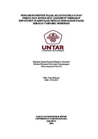 Radyasa, Yoga (2023) Pengaruh Insentif Pajak, Kualitas Pelayanan Fiskus, dan Sistem Self Assesment Terhadap Kepatuhan Wajib Pajak dengan Soaialisasi Pajak Sebagai Variabel Moderasi. Masters thesis, Universitas Tarumanagara.