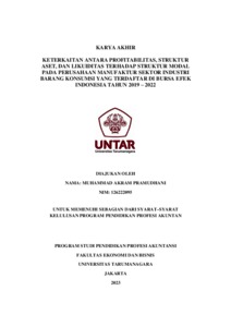 Pramudhani, Muhammad Akram (2023) Keterkaitan antara profitabilitas, struktur aset, dan likuiditas terhadap struktur modal pada perusahaan manufaktur sektor industri barang konsumsi yang terdaftar di Bursa Efek Indonesia tahun 2019-2022. Other thesis, Universitas Tarumanagara.