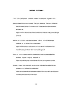 Seni pertunjukan wayang, asal Indonesia, mengandung nilai-nilai moral dan filosofi kehidupan manusia. Dalam pertunjukan ini, kisah Mahabharata sering dipertontonkan, dengan fokus pada karakter Karna. Karna, putra Dewa Surya yang dibuang dan dibesarkan oleh kusir istana, adalah sosok ksatria hebat yang pantang menyerah. Meskipun terjebak dalam lingkungan yang membuatnya terpisah dari Pandawa, Karna tetap menjalani hidup dengan dedikasi tinggi. Kisahnya mengajarkan tentang kesetiaan pada kebenaran dan tanggung jawab, meskipun berada di pihak yang salah. Namun, hasil wawancara menunjukkan bahwa museum wayang memiliki halangan dalam menarik daya tarik pengunjung sehingga diperlukan adanya perancangan animasi yang mengangkat salah satu tokoh wayang dan karakter tersebut Karna dari kisah Mahabharata.