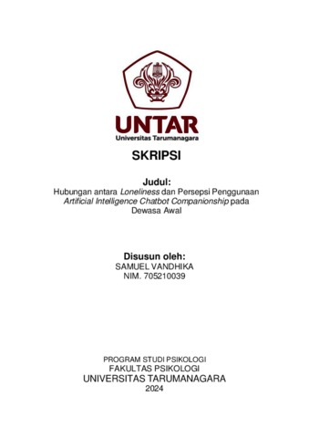 Vandhika, Samuel (2024) Hubungan antara Loneliness dan Persepsi Penggunaan Artificial Intelligence Chatbot Companionship pada Dewasa Awal. Skripsi thesis, Universitas Tarumanagara.