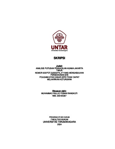 Rangkuti, Muhammad Rullie Febian (2024) Analisis Putusan Pengadilan Agama Jakarta Timur Nomor 635/Pdt.G/2023/Pa.Jt Yang Mengabulkan Permohonan Izin Poligami Atas Dasar Istri Tidak Dapat Melahirkan Keturunan. Skripsi thesis, Universitas Tarumanagara.