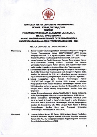 Gunardi, Lie Keputusan Rektor Universitas Tarumanagara Nomor 8058-KR/UNTAR/X/2021. Universitas Tarumanagara.
