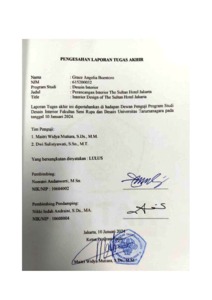 The Sultan Hotel, sebelumnya dikenal sebagai Hilton International Hotel, mengalami transformasi dalam konsep menjadi hotel mewah dengan nuansa budaya Jawa. Laporan ini mengeksplorasi lokasi, struktur organisasi, dan deskripsi pekerjaan yang menjadi dasar bagi perancangan interior. Analisis juga mencakup pengaruh desain interior, kualitas layanan terhadap minat tamu hotel, serta konsep hotel sebagai hotel bisnis dan destinasi pariwisata.