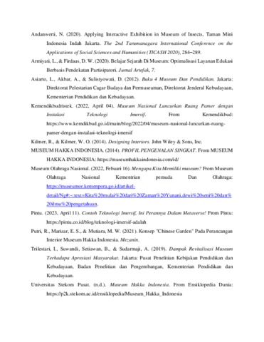 Indonesia dengan slogannya Bhineka Tunggal Ika merupakan negara yang memiliki keberagaman budaya, suku, agama, dan ras. Keberagaman ini dilestarikan melalui museum- museum di berbagai daerah. Museum memiliki peran utama dalam melindungi, mengembangkan, dan memanfaatkan koleksi berupa benda, bangunan, atau struktur yang diakui sebagai Cagar Budaya atau yang tidak termasuk dalam kategori tersebut. Penting sekali bagi pelestarian museum guna selalu memberi pelajaran terbaik terkait keberagaman Indonesia. Adanya perancangan ini ditujukan untuk menghasilkan rancangan alur sirkulasi yang baik, menghasilkan interior ruang pamer yang memanfaatkan teknologi informasi digital untuk menambah ketertarikan pengunjung, dan menghasilkan penataan sajian koleksi ruang pamer yang menarik. Penulis melakukan perancangan menggunakan metode perancangan delapan tahapan yang diambil dari buku Rosemary Kilmer yang berjudul “Designing Interiors". Tahapannya yaitu commit, state, collect, analyze, ideate, choose, implement, dan evaluate. Dengan tema “Hakka Heritage Unveiled: A Multigenerational Exploration” yang menggambarkan penyebaran dan pelestarian budaya Hakka secara turun-temurun dari berbagai generasi. Menghasilkan alur sirkulasi satu arah yang lebih tertata bagi pengunjung, menerapkan teknologi video wall LED dan LCD touch screen pada display ruang pamer, dan menerapkan konsep kontekstual dengan pendekatan gabungan untuk penyajian koleksi ruang pamer.