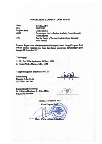 Audrys, Yovela (2023) Perancangan interior Larissa Aesthetic Center Senopati Jakarta Selatan (DI - 2479). Skripsi thesis, Universitas Tarumanagara.