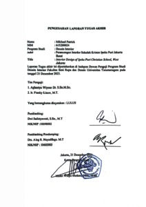 Patrick, Mikhael (2023) Perancangan interior sekolah kristen Ipeka Puri Jakarta Barat (DI - 2485). Skripsi thesis, Universitas Tarumanagara.