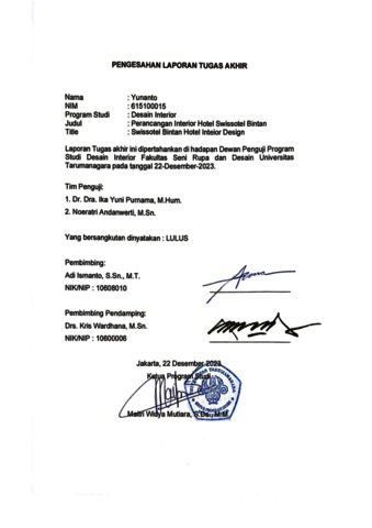 Yunanto, Yunanto (2023) Perancangan interior hotel Swissotel Bintan (DI - 2491). Skripsi thesis, Universitas Tarumanagara.