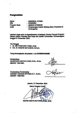 Utama, Missheal (2023) Perancangan interior Shining Stars Preschool & Kindergarten (DI - 2537). Skripsi thesis, Universitas Tarumanagara.