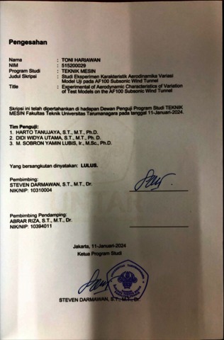 Hariawan, Toni (2024) Studi eksperimen karakteristik aerodinamika variasi model uji AF100 subsonic wind tunnel (TM - 1382). Skripsi thesis, Universitas Tarumanagara.