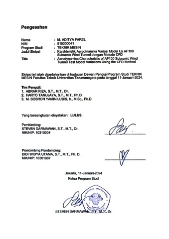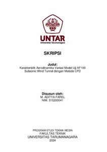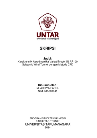 Farel, M. Aditya (2024) Karakteristik aerodinamika variasi model uji AF100 subsonic wind tunnel dengan metode CFD (TM - 1393). Skripsi thesis, Universitas Tarumanagara.