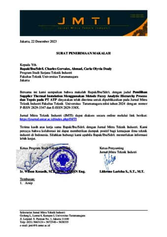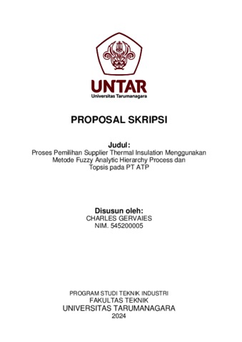Gervaies, Charles (2024) Proses pemilihan supplier thermal insulation menggunakan metode Fuzzy analytic hierarchy process dan Topis pada PT ATP (T. Ind - 837). Skripsi thesis, Universitas Tarumanagara.