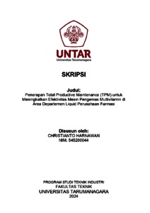 Harnawan, Christianto (2024) Penerapan total productive maintenance (TPM) untuk meningkatkan efektivitas mesin pengemas multivitamin di area departemen liquid perusahaan farmasi (T. Ind - 865). Skripsi thesis, Universitas Tarumanagara.