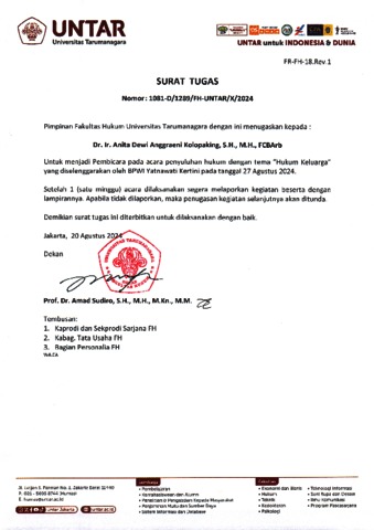 Kolopaking, Anita D.A. Surat Tugas Nomor: 1081-D/1289/FH-UNTAR/X/2024. Universitas Tarumanagara.