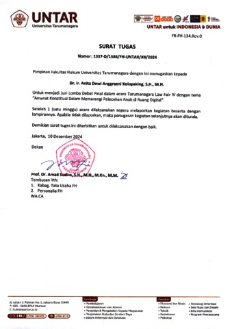 Kolopaking, Anita D.A. Surat Tugas Nomor: 1337-D/1584/FH-UNTAR/XII/2024. Universitas Tarumanagara.