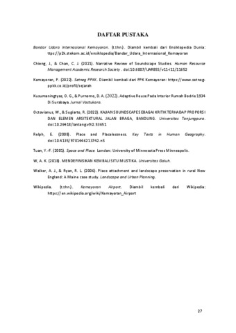 Place merupakan suatu tempat yang memiliki sebuah makna bagi seseorang ataupun dari sebuah tempatnya. Hilangnya makna tersebut akan menjadikan fenomena Placeless Place bagi suatu tempat. Seiring perkembangan zaman, banyak tempat yang mulai kehilangan maknanya salah satunya adalah Bandara Lama Kemayoran. Bandara Lama Kemayoran merupakan tempat bersejarah dengan nilai potensi kawasan yang signifikan. Sebagai bandara pertama di Indonesia dan bandara internasional tersibuk di masanya, Bandara Lama Kemayoran memiliki makna mendalam bagi sejarah penerbangan Indonesia. Namun, sejak resmi ditutup pada tahun 1991, bandara ini kehilangan fungsi dan eksistensinya, menjadi bangunan terbengkalai yang tak terawat. Penelitian ini bertujuan untuk mengembalikan identitas, budaya, dan sejarah Bandara Lama Kemayoran melalui pendekatan arsitektural Adaptive Reuse. Pendekatan ini melibatkan pemanfaatan kembali struktur bangunan lama dengan fungsi baru agar tetap memanfaatkan bagian dari dari sejarah yang terisa dan diharapkan menjadi potensi sarana rekreasi dan edukasi yang baru. Dengan demikian, potensi bandara ini dapat dimaksimalkan untuk menghadirkan wajah baru di Kemayoran, sekaligus mempertahankan warisan sejarah Bandara Lama Kemayoran maupun potensi dari sejarah-budaya Kemayoran sendiri yang memang kental dengan kebudayaan betawi. Dengan mengkolaborasikan kedua fungsi ini dapat menjadikan cirikhas dari bangunan ini. Melalui penelitian kualitatif, diharapkan pengembangan Bandara Lama Kemayoran dapat memberikan manfaat jangka panjang bagi masyarakat, menjadikannya tempat yang bermakna kembali dan memperkuat identitas lokal.