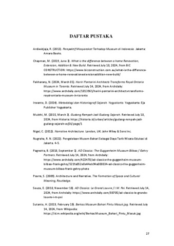 Museum Bahari memegang peran penting dalam pelestarian dan penyebaran pengetahuan mengenai budaya dan sejarah bahari. Dalam upaya untuk memperluas fungsi dan daya tarik museum ini, penerapan konsep arsitektur yang tepat menjadi sangat krusial. Penelitian ini mengeksplorasi bagaimana penerapan konsep arsitektur naratif dapat digunakan untuk merancang ekstensi Museum Bahari. Arsitektur naratif, yang menggabungkan elemen- elemen cerita dalam desainnya, memungkinkan pengunjung untuk merasakan dan memahami sejarah bahari secara lebih mendalam dan interaktif. Melalui analisis kasus studi, observasi lapangan, penelitian ini mengidentifikasi elemen-elemen kunci yang harus dipertimbangkan dalam perancangan ekstensi tersebut. Hasil penelitian menunjukkan bahwa integrasi elemen-elemen budaya bahari dan sejarah bahari dalam desain arsitektur dapat meningkatkan pengalaman pengunjung, memperkuat identitas museum, dan mendukung upaya konservasi budaya. Pendekatan arsitektur naratif tidak hanya memperkaya nilai estetika bangunan, tetapi juga memberikan kontribusi signifikan terhadap edukasi dan pelestarian warisan bahari. Saran yang diberikan mencakup melibatkan komunitas lokal dan pakar maritim dalam proses desain, serta mengadopsi teknologi baru untuk menciptakan ruang yang lebih interaktif dan menarik bagi berbagai kalangan pengunjung. Selain itu, program pendidikan dan aktivitas berbasis komunitas yang berfokus pada budaya bahari juga disarankan untuk meningkatkan keterlibatan publik dan mendukung pelestarian warisan maritim. Dengan demikian, Museum Bahari dapat menjadi pusat edukasi dan pelestarian budaya yang dinamis, relevan, dan menginspirasi bagi semua generasi. Pendekatan yang inklusif dan kolaboratif ini tidak hanya akan memperkuat daya tarik museum tetapi juga memastikan bahwa nilai-nilai budaya dan sejarah bahari tetap hidup dan dipahami oleh masyarakat luas.
