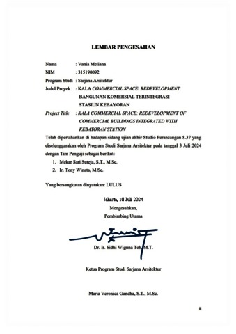 Meliana, Vania (2024) Kala commercial space: redevelopment bangunan komersial terintegrasi stasiun Kebayoran. Skripsi thesis, Universitas Tarumanagara.