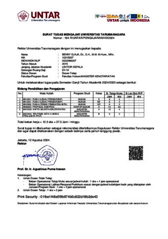 Djaja, Benny Surat Tugas Mengajar Nomor : 194-R/UNTAR/PENGAJARAN/VIII/2024. Universitas Tarumanagara.