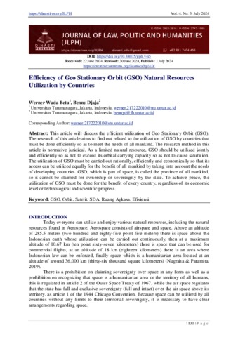 Betu, Werner Wada and Djaja, Benny (2024) Efficiency of Geo Stationary Orbit (GSO) Natural Resources Utilization by Countries. Journal of Law, Politic and Humanities (JLPH), 4 (5).