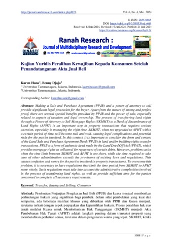 Hana, Karen and Djaja, Benny (2024) Kajian Yuridis Peralihan Kewajiban Kepada Konsumen Setelah Penandatanganan Akta Jual Beli. Ranah Research: Journal of Multidisciplinary Research and Development.