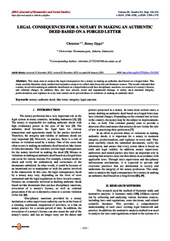 Christine, Christine and Djaja, Benny LEGAL CONSEQUENCES FOR A NOTARY IN MAKING AN AUTHENTIC DEED BASED ON A FORGED LETTER. JHSS (Journal of Humanities and Social Studies), 8 (1).