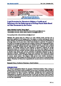Consoleo, Aditya Salsabila and Djaja, Benny (2024) Legal Protection for Notaries in Making a Certificate of Inheritance for the Disbursement of Savings Funds Made Based on False Documents by the Parties. JLPH Journal of Law, Politic and Humanities.