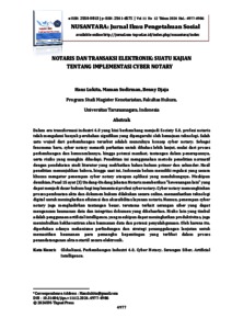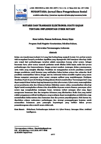 Lukita, Hans and Sudirman, Maman and Djaja, Benny (2024) NOTARIS DAN TRANSAKSI ELEKTRONIK: SUATU KAJIAN TENTANG IMPLEMENTASI CYBER NOTARY. NUSANTARA: Jurnal Ilmu Pengetahuan Sosial.