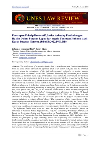 Rich, Johannes Immanuel and Djaja, Benny (2024) Penerapan Prinsip Restoratif Justice terhadap Pertimbangan Hakim Dalam Putusan Lepas dari segala Tuntutan Hukum( studi Kasus Putusan Nomor: 28/Pid.B/2022/PN.LBB). UNES Law Review.