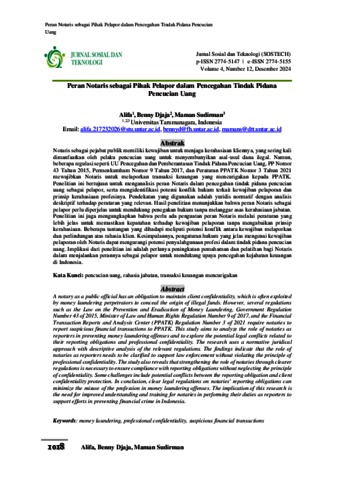 Alifa, Alifa and Djaja, Benny and Sudirman, Maman (2024) Peran Notaris sebagai Pihak Pelapor dalam Pencegahan Tindak Pidana Pencucian Uang. Jurnal Sosial dan Teknologi (SOSTECH).