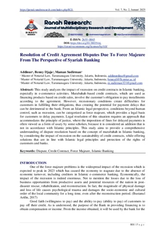 Addinur, Addinur and Djaja, Benny and Sudirman, Maman (2025) Resolution of Credit Agreement Disputes Due To Force Majeure From The Perspective of Syariah Banking. Ranah Research: Journal of Multidisciplinary Research and Development.