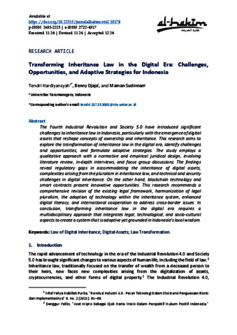 Hardiyansyah, Tendri and Djaja, Benny and Sudirman, Maman Transforming Inheritance Law in the Digital Era: Challenges, Opportunities, and Adaptive Strategies for Indonesia. Al-Hakim.