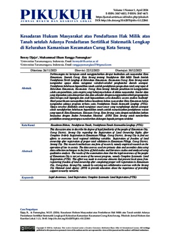 Djaja, Benny and Pamungkas, Muhammad Ilham Rangga Kesadaran Hukum Masyarakat atas Pendaftaran Hak Milik atas Tanah setelah Adanya Pendaftaran Sertifikat Sistematik Lengkap di Kelurahan Kamanisan Kecamatan Curug Kota Serang. PIKUKUH Jurnal Hukum dan Kearifan Lokal.