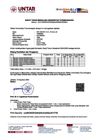 Hadiati, Mia Surat Tugas mengajar. Universitas Tarumanagara.