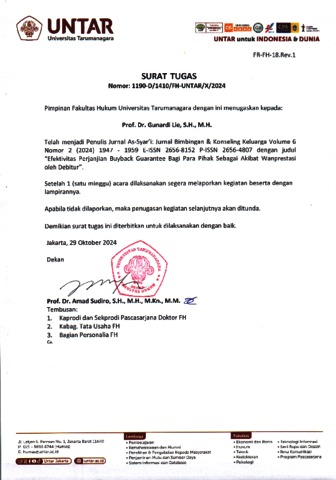 Aulianur, Prima Riza and Gunardi, Lie (2024) Efektivitas Perjanjian Buyback Guarantee Bagi Para Pihak Sebagai Akibat Wanprestasi oleh Debitur. As-Syar’i: Jurnal Bimbingan & Konseling Keluarga, 6 (2).