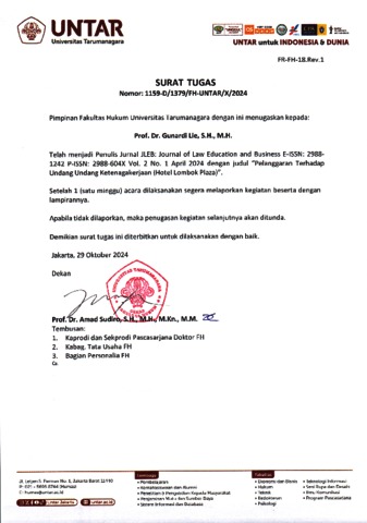 Max, Alessandro Christian and Gunardi, Lie and Putra, Moody Rizqy Syailendra (2024) Pelanggaran Terhadap Undang Undang Ketenagakerjaan (Hotel Lombok Plaza). JLEB: Journal of Law Education and Business, 2 (1).