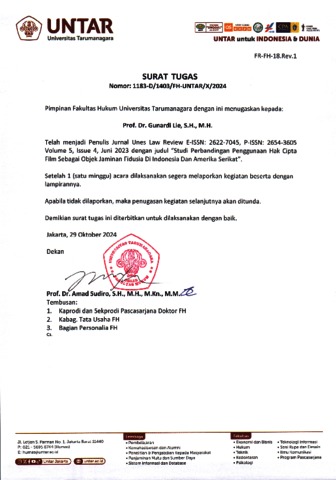 Halim, Dianita and Gunardi, Gunardi (2023) STUDI PERBANDINGAN PENGGUNAAN HAK CIPTA FILM SEBAGAI OBJEK JAMINAN FIDUSIA DI INDONESIA DAN AMERIKA SERIKAT. Unes Law Review.