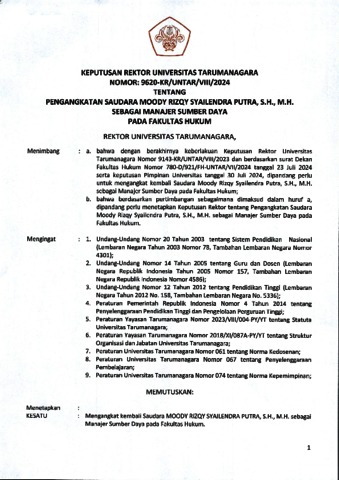Putra, Moody Rizqy Syailendra Keputusan Rektor Universitas Tarumanagara Nomor: 9620-KR/UNTAR/VIII/2024. Universitas Tarumanagara.
