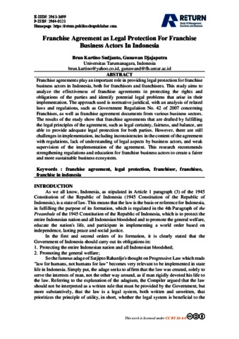 Sudjanto, Brun Kartino and Djajaputra, Gunawan Franchise Agreement as Legal Protection For Franchise Business Actors In Indonesia. Return: Study of Management Economic and Business.