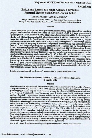 Kumala, Meilani and M.Siagian, Carmen (2007) Efek Asam Lemak Tak Jenuh Omega-3 Terhadap Agregasi Platelet Pada Orang Dewasa Sehat. Majalah Kedokteran FK UKI.